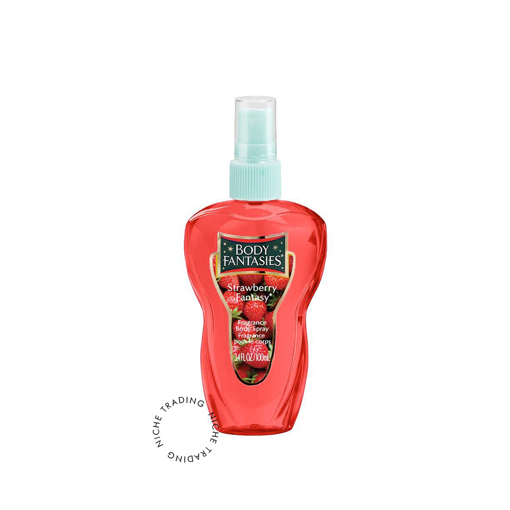 Body spray offers a sweet fruity scent. ... This Body Fantasies body spray contains the sweet fruity scent of strawberries that makes you feel fresh and energetic all day long. Its big 236ml capacity allows you to use it continuously for weeks.
