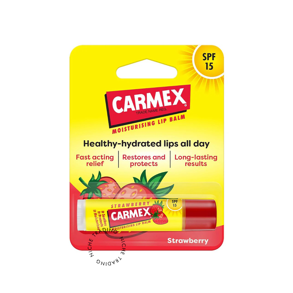 The Carmex Strawberry Lip Balm Stick (4.25g) provides nourishing care with a fruity flair. This twist-up stick features the classic Carmex formula, including SPF15 for sun protection, along with the juicy flavor of fresh strawberries. Ideal for everyday use, this balm soothes, softens, and protects lips while leaving them with a subtle scent and natural finish.