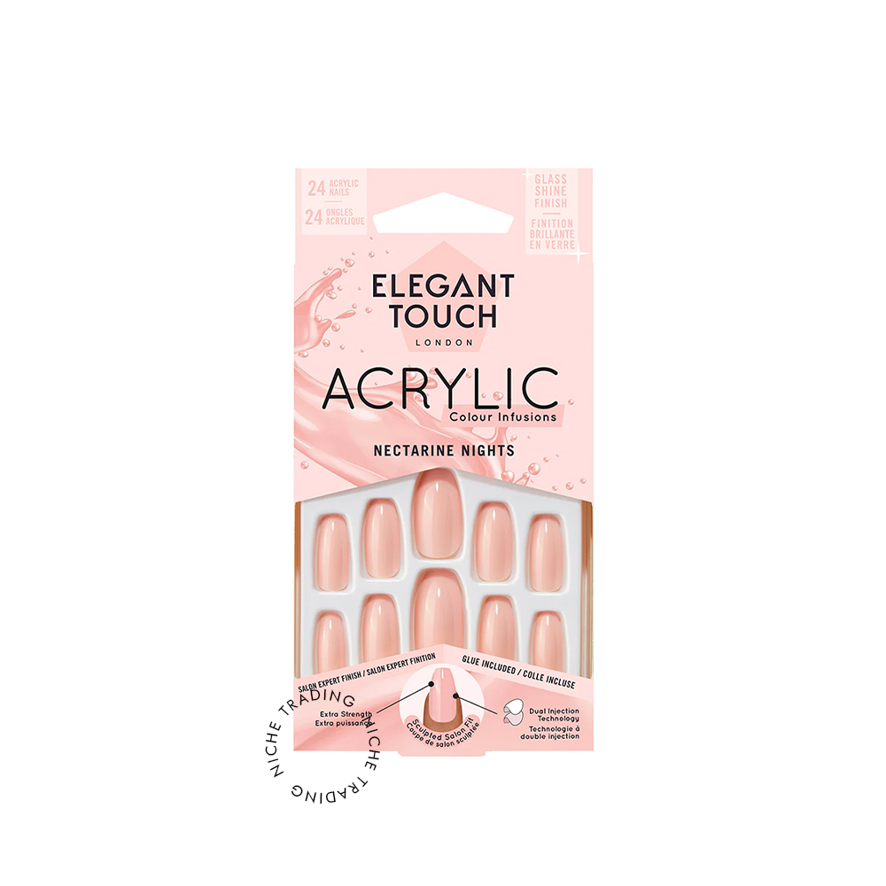 Elegant Touch Acrylic Colour Infusions false nails in style Nectarine Nights boasts a delectable peachy nude hue. Nectarine Nights from Elegant Touch nails have long length, with a coffin crafted design and glass shine finish.