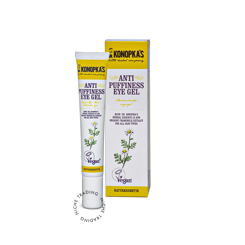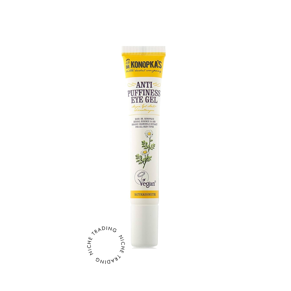 This restorative anti-puffiness eye gel uses Dr. Konopkas special organic herbal essence No. 54. With vitamins and mineral nutrients that are essential for nourishing and repairing the delicate skin around the eyes. Combined with organic chamomile extract it helps to reduce swelling and dark circles, leaving eyes shining and looking more relaxed. Suitable for all skin types.